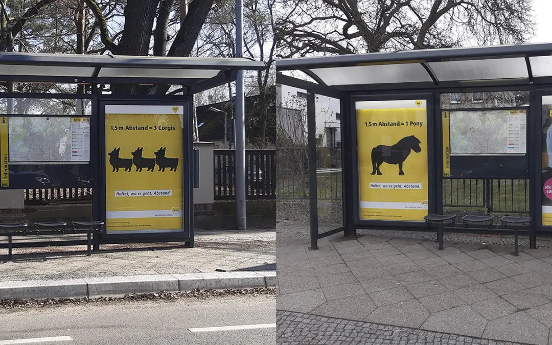Mit 1.200 neuen Plakaten im CLP Format geht in die BVG wieder in die Offensive und appelliert an die Einhaltung der AHA Regeln. Das eine Motiv zeigt, dass drei Corgis ungefähr 1,50 Meter sind, also der geforderte Abstand zum Nebenmann. Corgis ist eine britische Hunderasse mit royalem Touch. Die Queen hat viele Hunde, unter ihnen auch vier Corgis. Das Pony erinnert ebenfalls an den Abstand. Das dritte Motiv wirbt für die BVG App, mit der einfach, bequem und übersichtlich alle Tickets gebucht und bezahlt werden können.