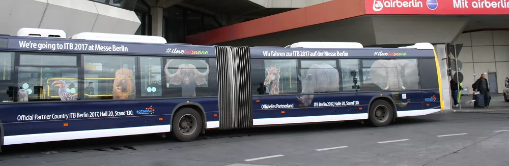 Natur pur: In Botswana gibt es mehr Elefanten als Menschen, hinzu kommen noch Löwen, Giraffen, Gnus und so weiter. Mit der Kampagne auf den Bussen war man dem Wildreservat und der Safari ganz nahe. Mit der Airportlinie entschied sich Botswana ganz bewusst für eine exklusive Linie vom Airport zum Hauptbahnhof, am Brandenburger Tor vorbei, Unter den Linden zum Alexanderplatz. Mehr Berlin geht nicht. Und im Sommer wollen sie wieder für eine Safari in Berlin werben.