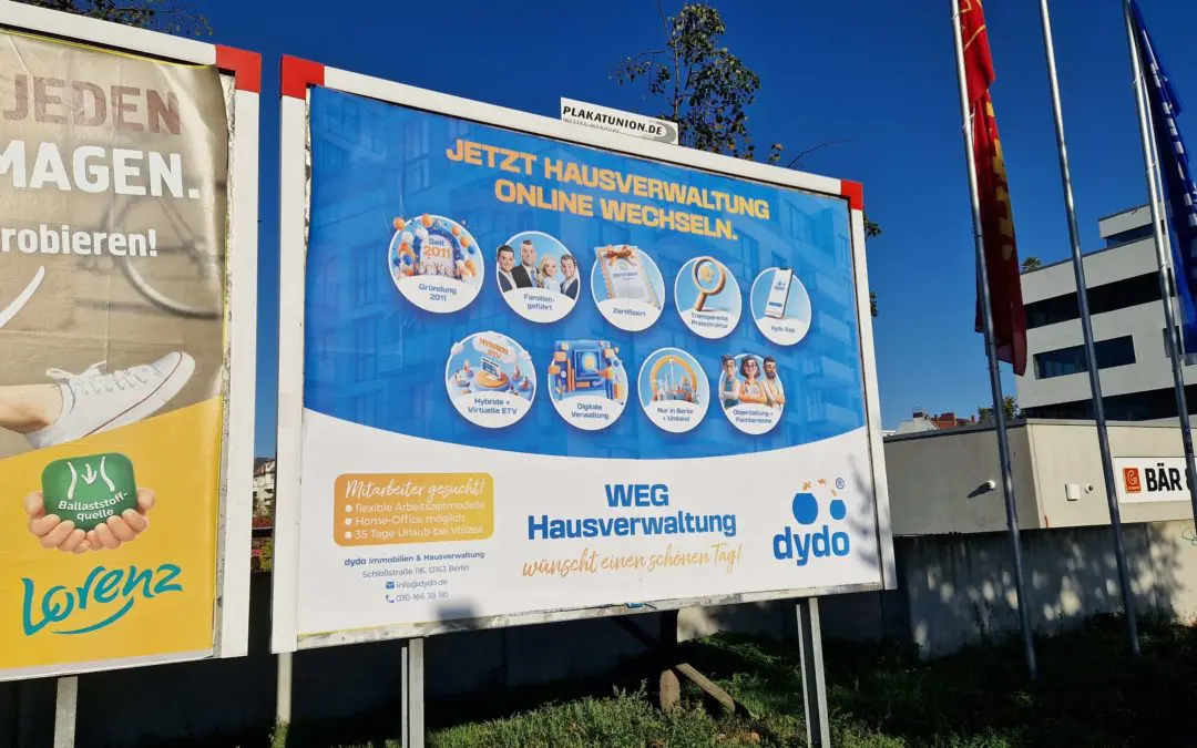 Die Hausverwaltung Dydo nutzt eine Großfläche, um gezielt auf ihre aktuellen Stellenangebote hinzuweisen. Diese Plakatwerbung steigert die Sichtbarkeit des Unternehmens und zieht potenzielle Bewerber an, die sich für eine Karriere in der Immobilienverwaltung interessieren. Dank der strategischen Platzierung in Steglitz erreicht Dydo genau die richtige Zielgruppe.