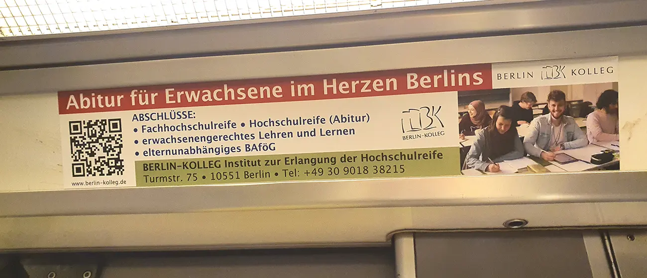 Dass Bildung ein wichtiger Schritt zum Erfolg ist, sollte den Meisten klar sein. Neben staatlichen Hochschulen und Universitäten gibt es zudem eine Vielzahl von privaten Instituten, sowie Aus- und Weiterbildungsangeboten. Doch in welchem Institut sollte man welche Kurse belegen oder welche Ausbildung machen? Um sich im hart umkämpften Markt um Schüler und Studenten durchzusetzen, zählen viele Berliner Weiterbildungsinstitute auf Innenwerbung in den öffentlichen Verkehrsmitteln: Bus, Tram, S-Bahn und U-Bahn.