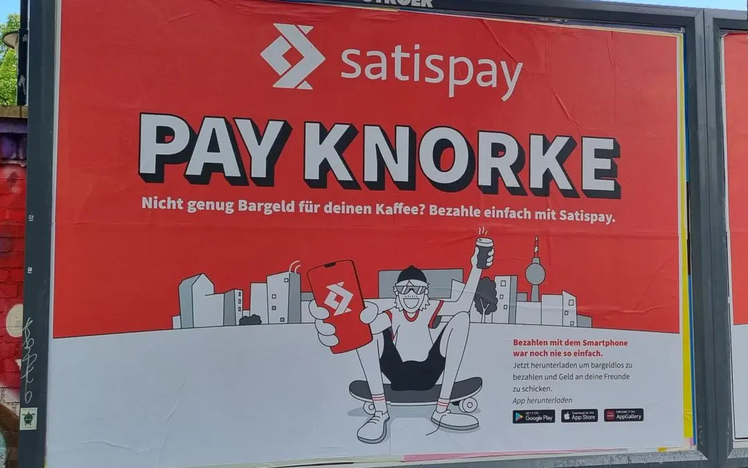 Im Juni 2022 war es so weit: mit Plakatwerbung in Berlin Kreuzberg und Neukölln startete die italienische Zahlungsabwicklungs-App Satispay eine große, und knorke, Kampagne, um die Bekanntheit und App-Downloads in Berlin zu erhöhen. Sie hatten im Umkreis von Kreuzberg und Nord-Neukölln Geschäfte akquiriert, die ihren Zahlungsdienst akzeptieren. Mit der Plakatwerbung auf 11 Ganzsäulen, 1 City Light Säule, und 105 Großflächen auf der Straße, sowie dem digitalen City Light Poster Netz HUB Kreuzberg, weiteren Großflächen auf U-Bahnhöfen und einiger Bodenfolien sollten nun die Kreuz-Köllner angesprochen werden. Da das Gebiet relativ klein war, entstand durch die Buchung dieser großen Anzahl verschiedener Plakatmedien ein enormer Werbedruck. Wenn möglich wurden auch Plakatflächen nebeneinander belegt, auf denen dann verschiedene Motive platziert wurden. Satispay war in Berlin Kreuzberg einfach unübersehbar!
