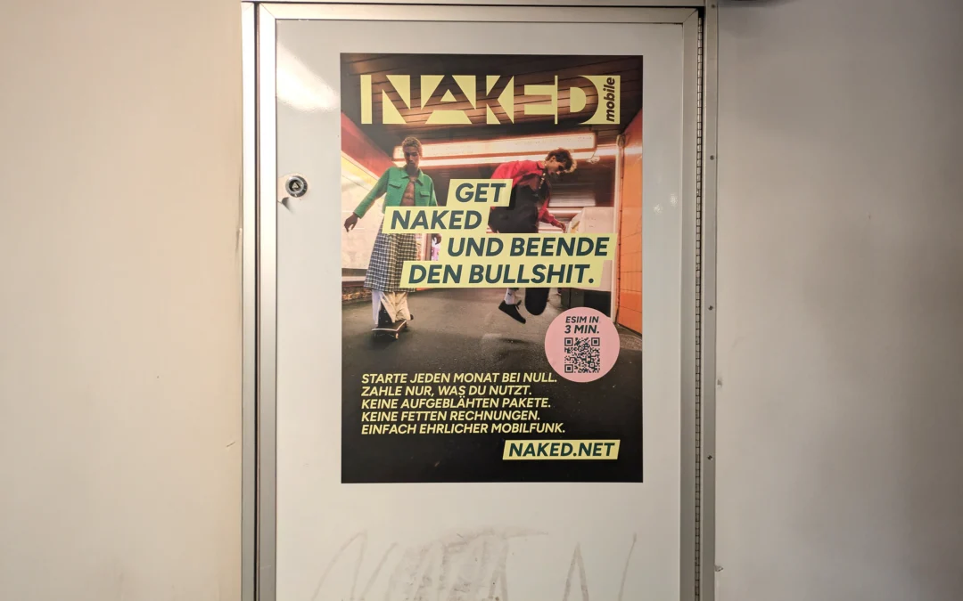 Naked on end-wall panels – the largest format in the subway 26. Feb 2026 | Uncategorized, Verkehrsmittel-Innenwerbung Client: Humans – Virtual Mobil Operator Placement: Berlin U-Bahn Motif: Naked Agency: direct