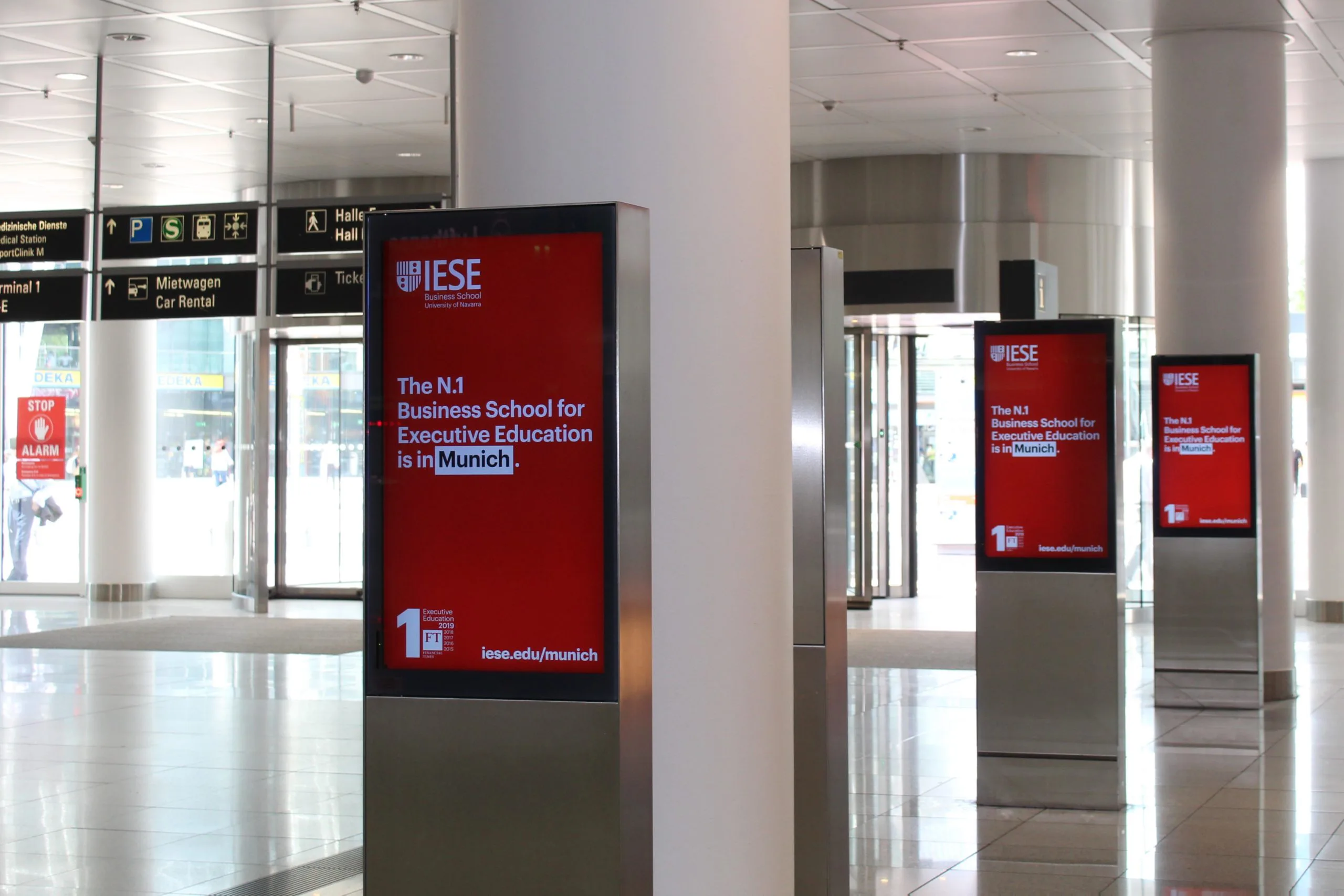 Um ihren Münchner Standort zu bewerben, schaltete die IESE vorerst Plakatwerbung. Mit der Belegung von Großflächen an drei S-Bahnstationen in München selektierten sie genau die Gegend, wo sie Ihre Zielgruppe vermuten. Im Anschluss belegte die IESE digitale Flächen am MUC Flughafen München. Im Normalbetrieb sind 48% der Fluggäste am Flughafen München Business Kunden. Da der Flugbetrieb im Moment weniger touristisch ist, ist der Prozentsatz der Businessreisenden sogar noch höher.